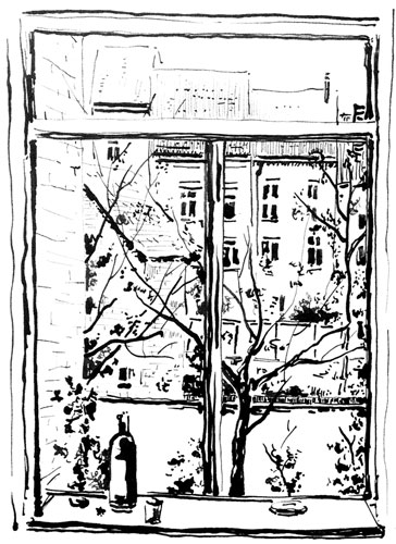 Petit croquis à l’encre de chine et à la plume depuis la fenêtre de la cuisine de nos amis lors d’une escapade bruxelloise. A travers les carreaux les premiers bourgeons des arbres en fleurs ne masquaient pas encore complètement les façades typiques de briques rouges des habitations flamandes.