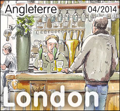 Parmi les nombreuses enseignes de cafés, bars, pubs et restaurants qui pullulent dans Londres, je me suis rendu au Café Rouge de St-Paul. Ces cafés véhiculent l’esprit français en Angleterre, la décoration y est particulièrement soignée (avec beaucoup de clichés français). Comme il faisait un froid de canard, j’en ai profité pour dessiner l’intérieur de l’établissement et les ballets de serveurs vêtus de noir et de blanc. J’en profite pour encore remercier chaleureusement le personnel : Alina et son équipe, pour l’intérêt qu’ils ont eu pour mes dessins !