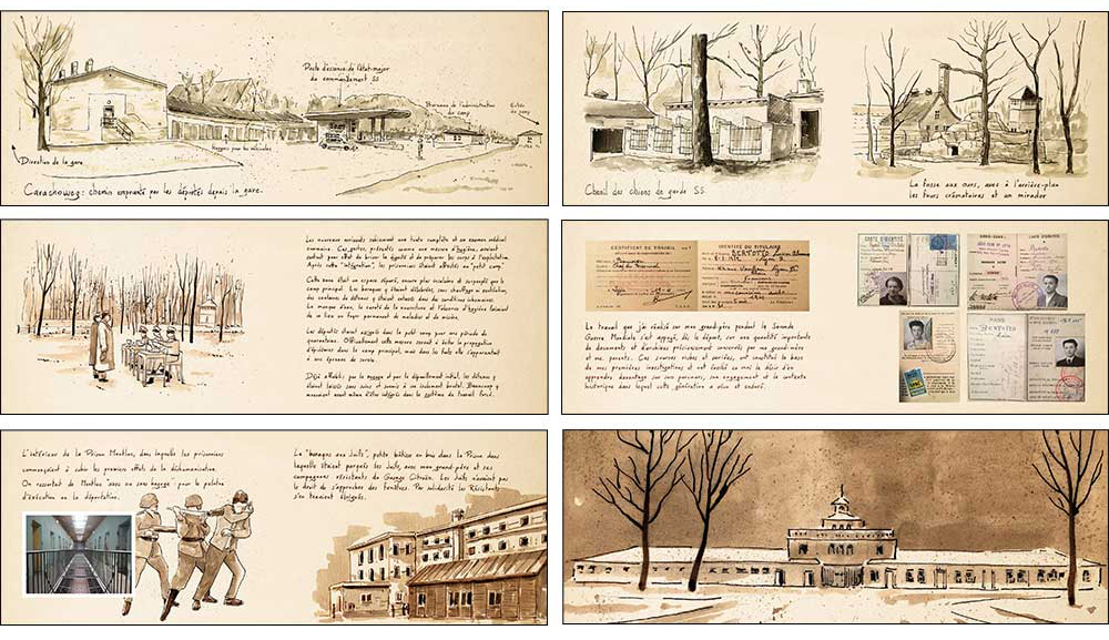 Chaque page témoigne d’un cheminement dans l’Histoire : dessins à l’encre sépia réalisés sur le vif, complétés par des illustrations et des notes recueillies auprès de spécialistes. Ce carnet propose un voyage sensible au cœur des lieux, pour comprendre et transmettre la mémoire de ceux qui ont traversé ces épreuves.